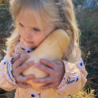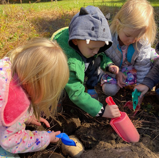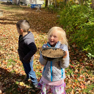 This week, we also extended on a book that this group has gotten to enjoy both in the classroom, and at library story time. Sophie's Squash is a story about a girl who loves a butternut squash so much she treats it like it is her little baby. Despite her parents' warnings, she refuses to believe that it won't last forever. Finally when a farmer advises her that a squash needs "dirt, sunshine, and lots of love" she tucks it in the ground in a blanket of dirt, only to be surprised when it is soon lost under the winter snow. The following Spring, she is elated to find a whole squash plant that appears in its place! Inspired by the story, we planted our own squash in the garden, with a "Sophie's Squash" sign that the children made to mark its place. We can't wait to check on it again in the spring to see if a plant comes up!