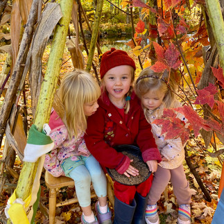 At this week's library story time, we learned about the traditions associated with the Jewish Sukkot holiday, and the class practiced designing their own sukkah shelters with sunflower stalks, corn stalks, and various treasures from nature's bounty. We've been extending on this at school by creating more sunflower stalk shelters and creating sukkah cakes in our mud kitchen!