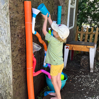 * WATER PLAY! We enjoyed the sprinklers, pool, mud kitchen, pump, water table, and our new water wall, where kids loved experimenting with the flow of water through funnels, pipes, flexible tubes, buckets, and more!