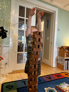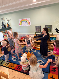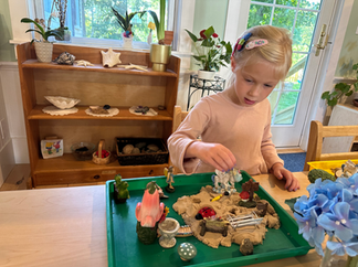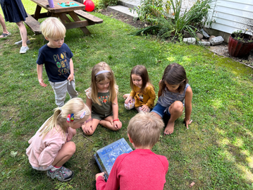 After getting inspired by some beautiful books about fairy homes, and practicing with materials in the classroom, we took the class outside to create fairylands using only natural materials. We set up a "fairy garden buffet" on the picnic table, which included items such as pinecones, stones, seashells, flowers, feathers, twigs, tree bark, and wood slices, and the children let their creativity take over from there! We loved watching them work with such enthusiasm and focus on their own masterpieces- providing a real treat to the local fairies!