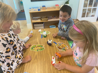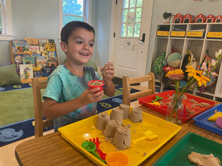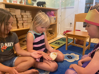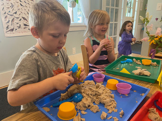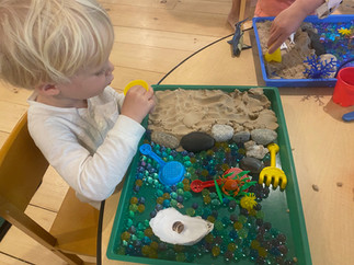 What a beautiful week we had exploring sand & sea together! The class enjoyed discovering treasures from the seaside, investigating them and creating their own observational drawings. They also thoroughly enjoyed building kinetic sand castles, swimming their ocean animal figures through seas of water beads, and playing pirate treasure games! We had such a fun ocean- themed Show & Tell, in which children told about a range of treasures they had found by the seaside, as well as some great ocean animal stuffies! The class was so amazed to see such a range of beautiful items that can be found at the ocean- from seaglass, to conch shells, to coral, to shark teeth, and more! All of these treasaures were accompanied by wonderful stories of adventures at the seaside, and the class was captivated by one another's show & tells. Our outside time involved fishing in the kiddie pool, imaginary ocean voyages, and lots of pirate treasure games! What a beautiful week it was. :)