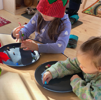 The play experiences this week were largely focused around Christmas, and the class was so creative in setting up their own "Santa's Workshop" in our classroom and "Gingerbread Cottage" in our outdoor playhouse. We also had fun playing "gingerbread man tag" on the playground (The gingerbread men run away from the bakers, and can take a rest in their "safe zone", the gingerbread cottage where the bakers can't find them.)