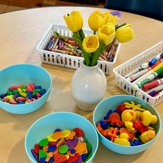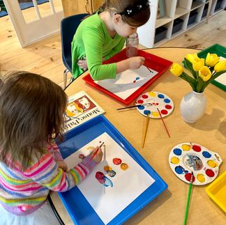 On rainy Thursday, when we spent more time indoors, we focused on the colors we can make in our artwork. We learned about how we can mix primary colors to make secondary colors and practiced mixing paints to create various shades of green, purple and orange! After this, we worked collaboratively to go on a color hunt around our classroom and create a large color wheel on the round table. The class had so much fun gathering items of every color of the rainbow and placing them on their designated color splotch on the round table in order to create a beautiful display of color.
